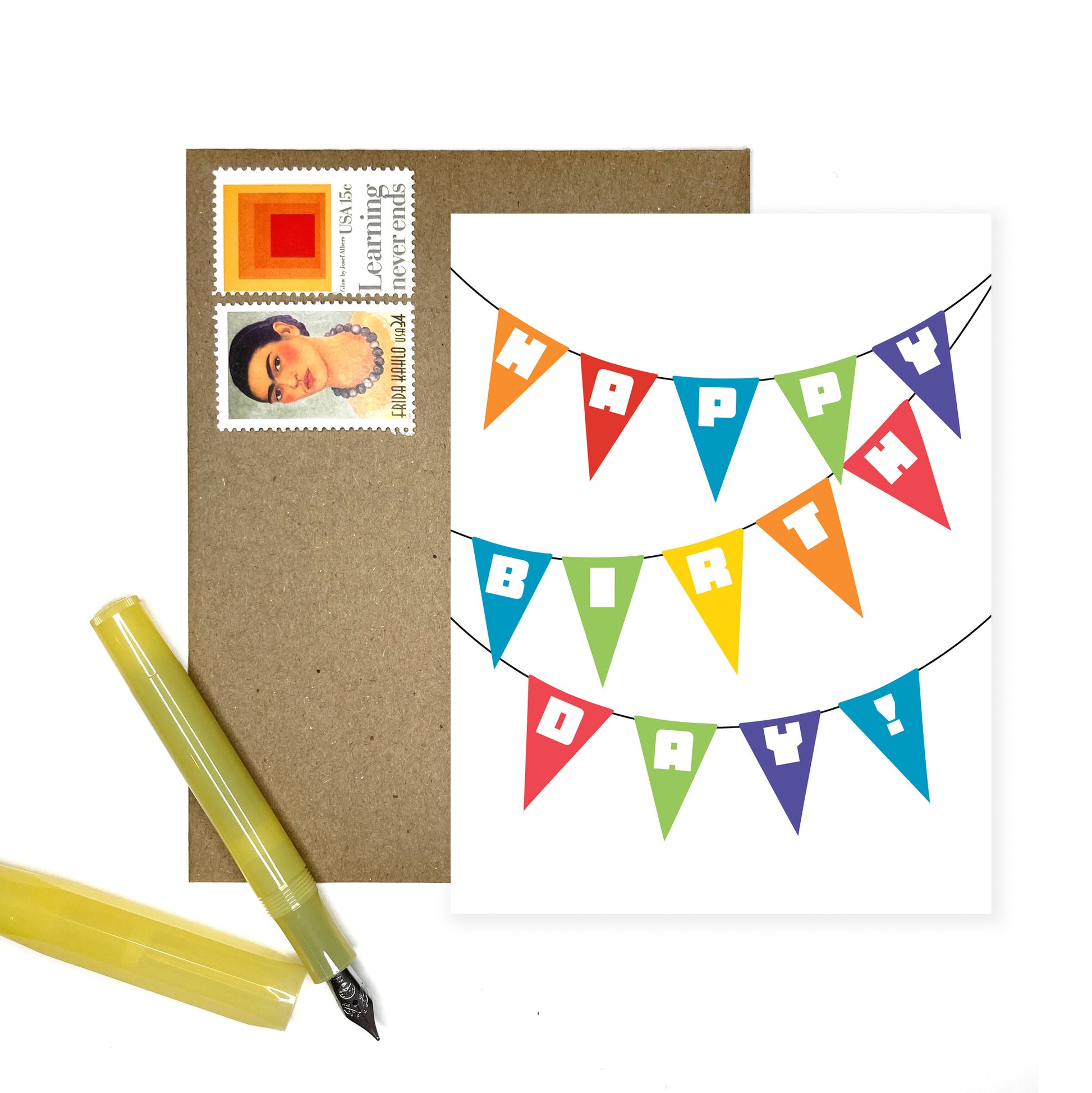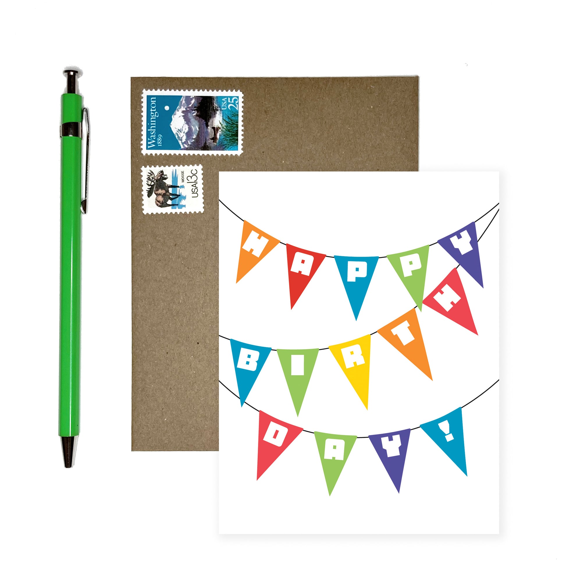 This card features a rainbow of flags on a banner spelling out "Happy Birthday." Great for milestone birthdays.
