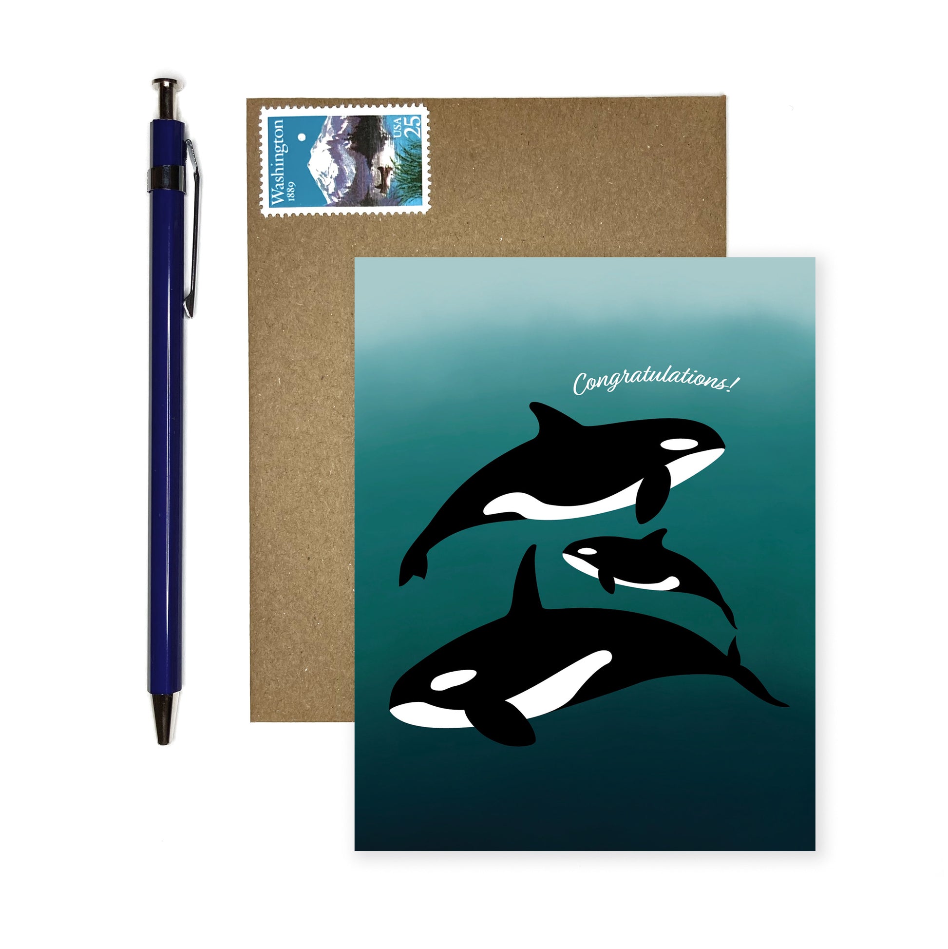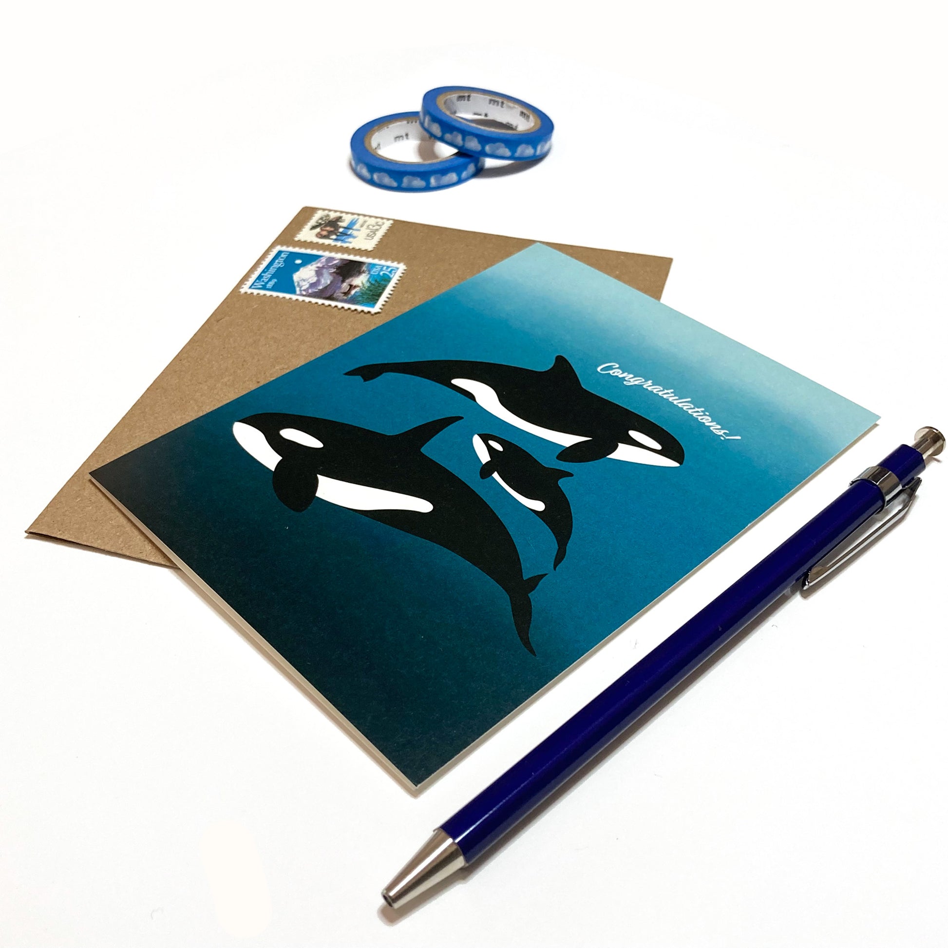 This dreamy congratulations card features two adult orcas and one baby orca. A great card for baby showers and new parents.