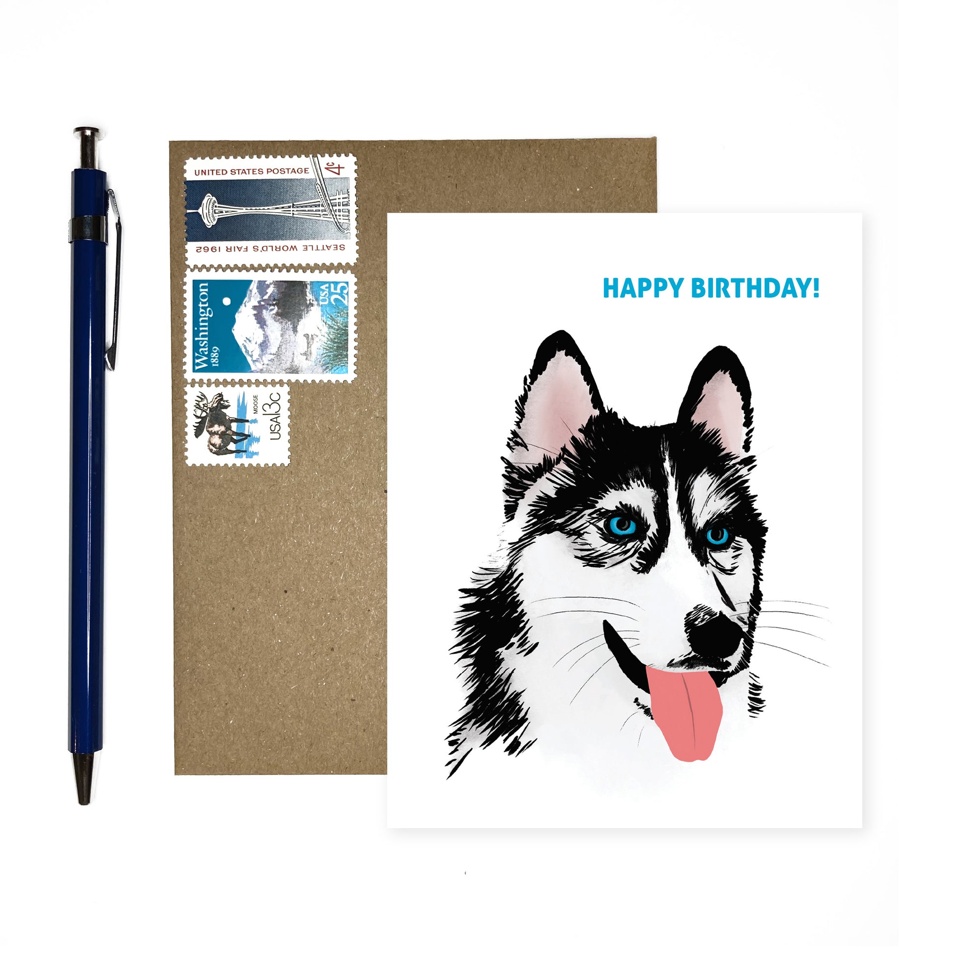 Whether your friends and family graduated from UW or are husky dog parents, this birthday card featuring a husky with blue eyes will be treasured.