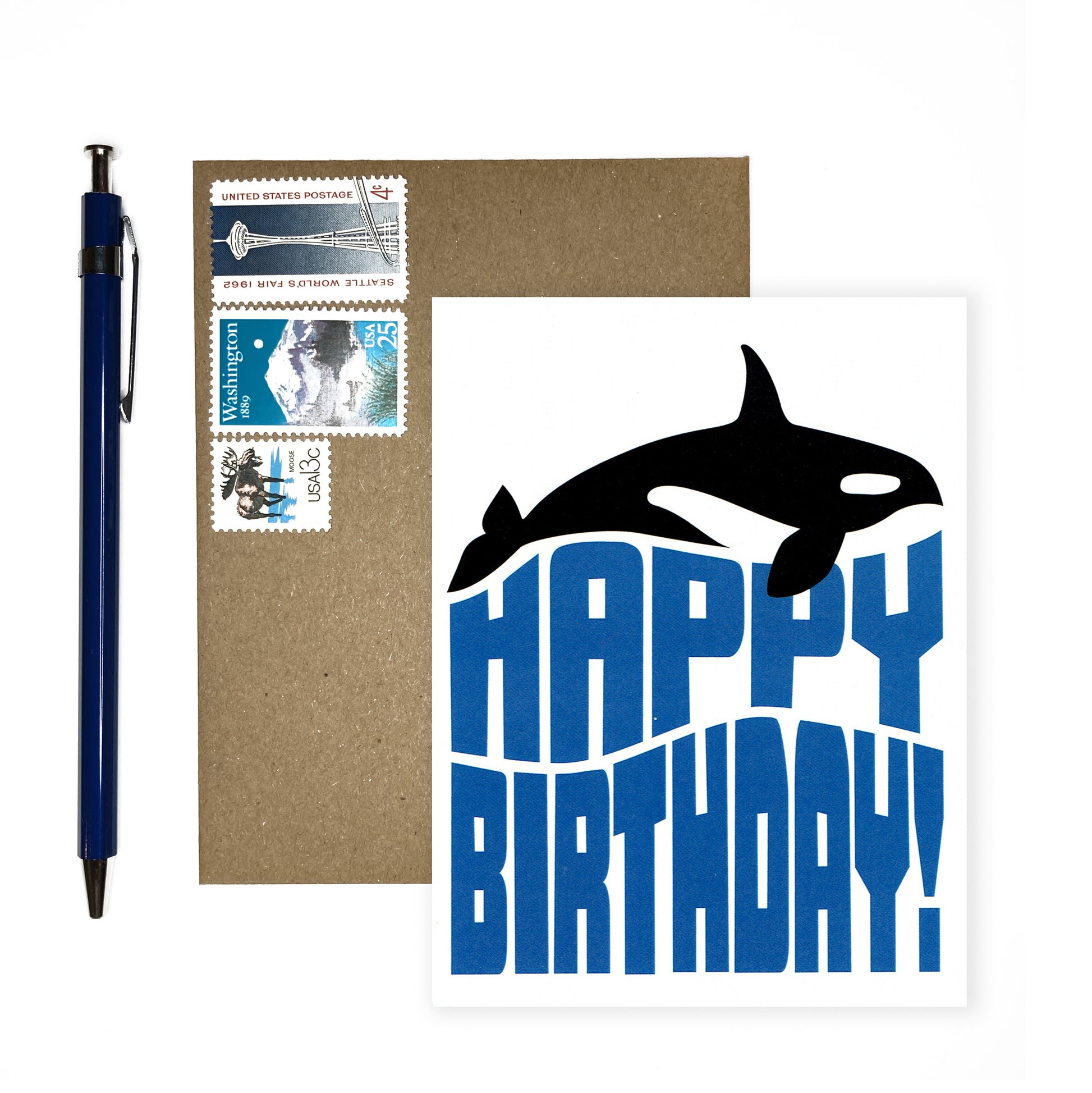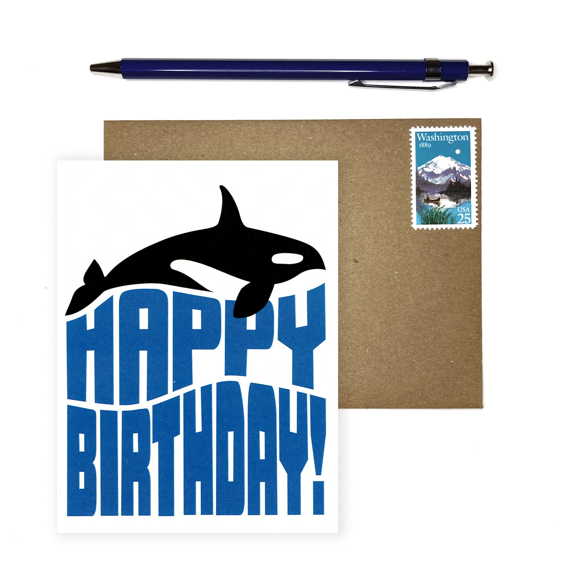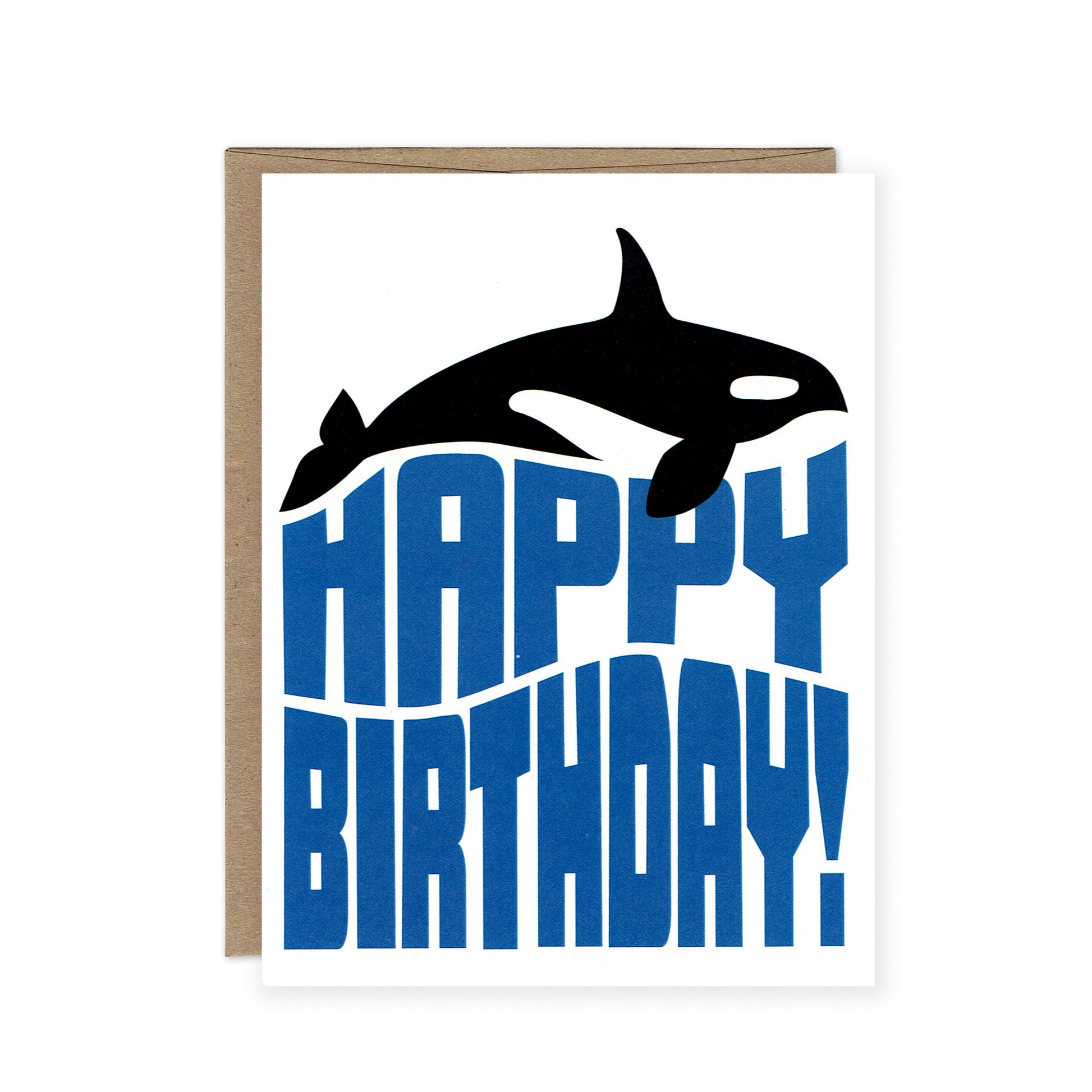 Wish your friends a whale of a birthday with this fantastic card featuring an Orca and the words “Happy Birthday” designed to look like ocean waves.