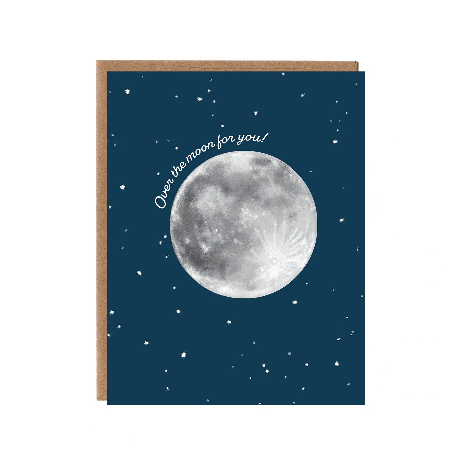 Shout your excitment into the cosmos with this Orange Twist card. It’s great choice to give to friends and family who are newly engaged, married, or pregnant and features our hand drawn moon against a beautiful dark blue sky and a smattering of stars with the words “Over the moon for you!”