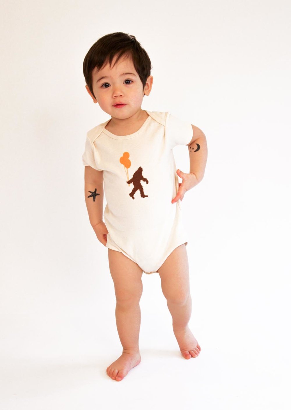 Everyone's favorite furry fellow is available hand screenprinted on a 100% organic cotton bodysuit. Sasquatch and his three yellow balloons are printed with water based ink on a natural color, one-piece.