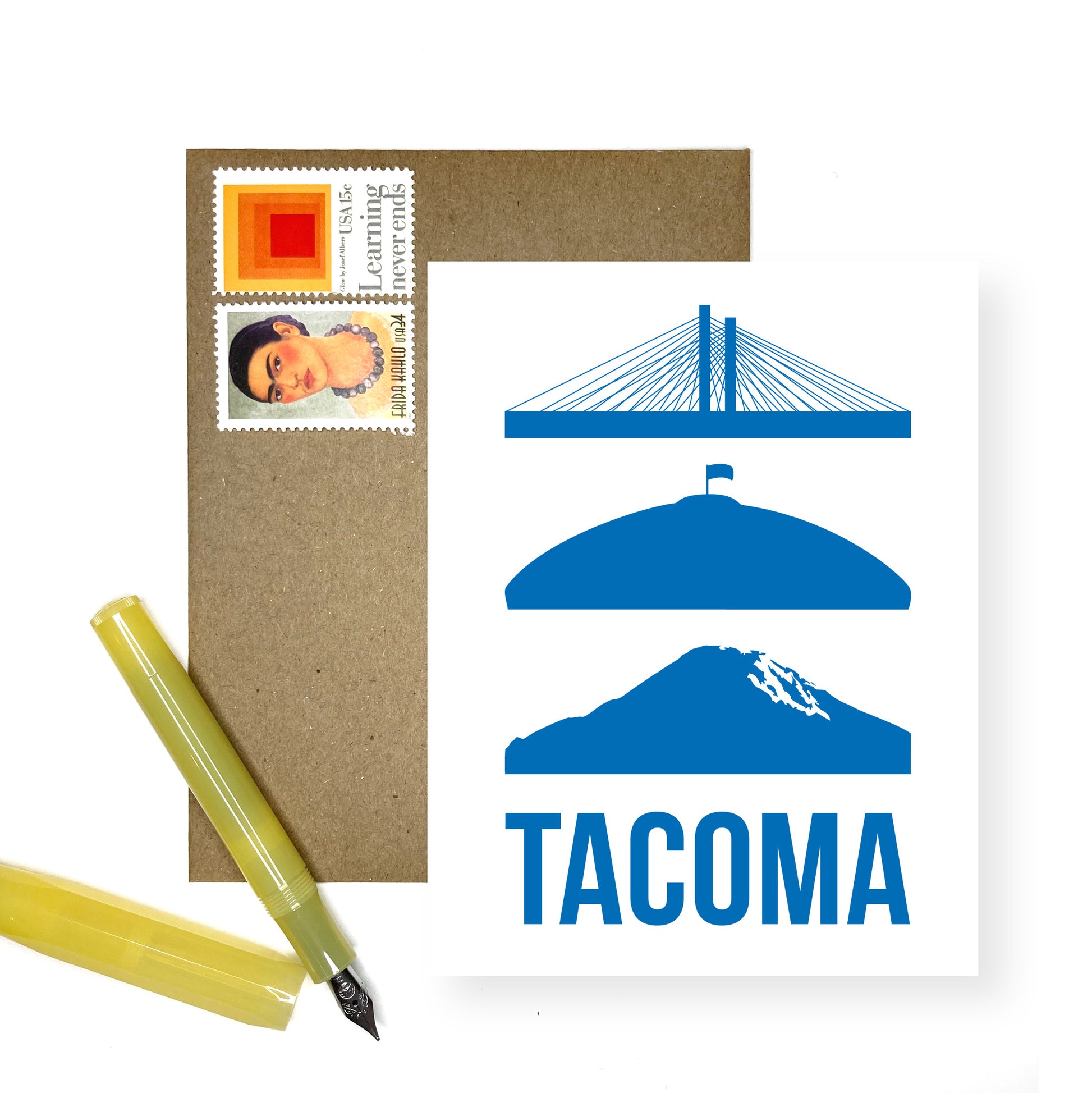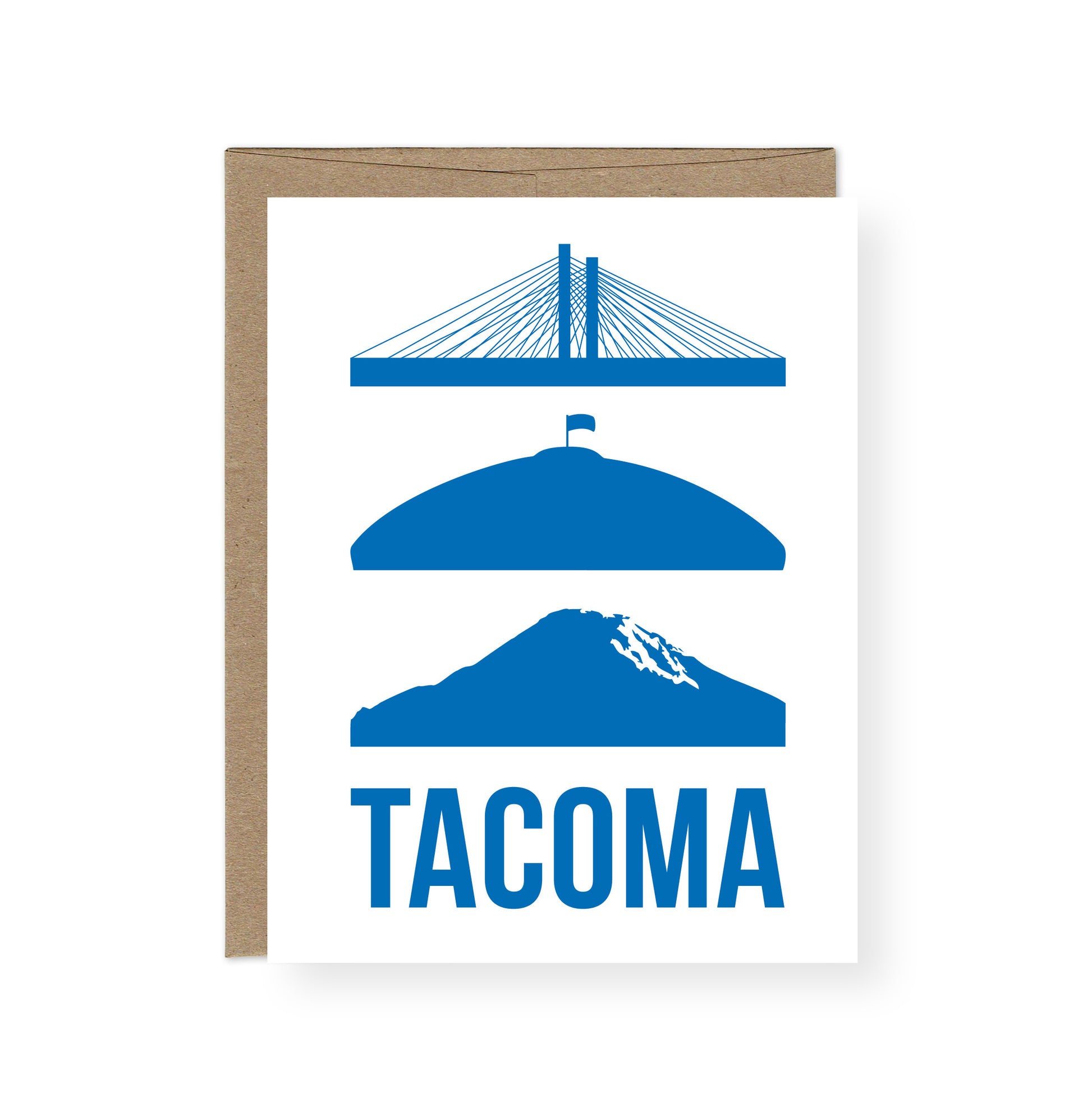 "Tacoma Icons" features Mount Rainier, the Tacoma Dome, the East 21st Street Bridge printed in a deep sky blue.